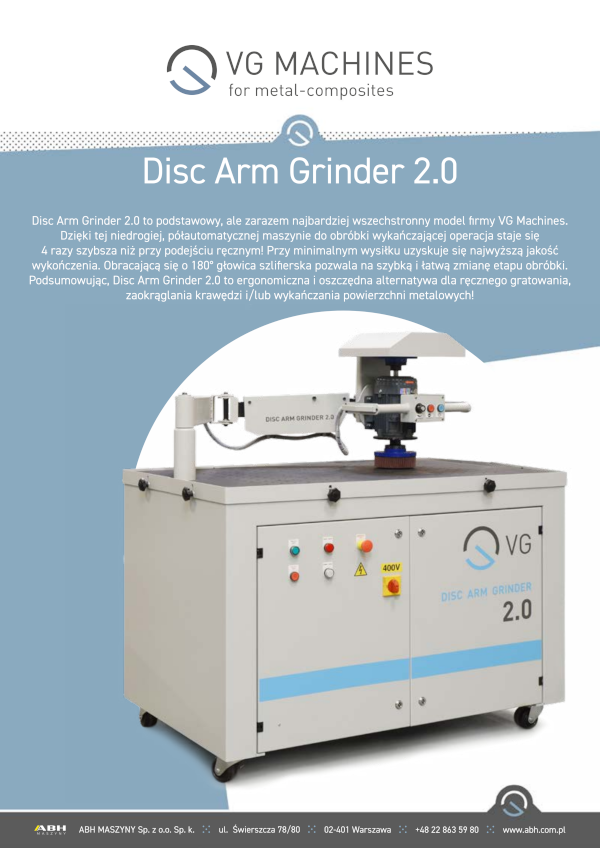 Disc Arm Grinder 2.0 jest drugą generacją półautomatu VG do wykańczania elementów metalowych. Pozwala na obróbkę małych i dużych części, które w maszynie mocowane są za pomocą elektromagnesów lub podciśnieniowo.